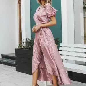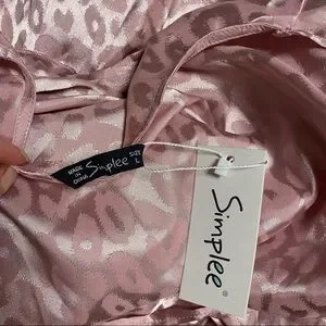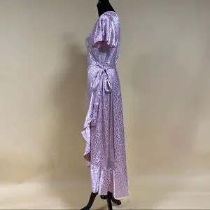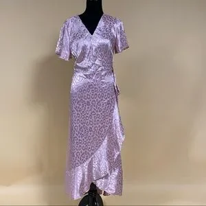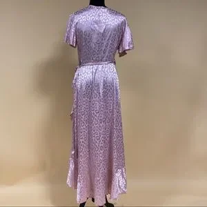 Simplee Dusty Pink Leopard Asymmetrical Ruffle Hem Wrap Belted Satin Dress Sz L