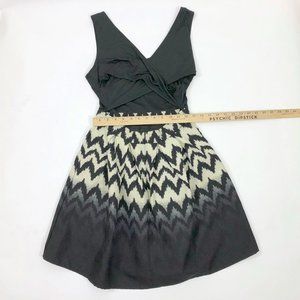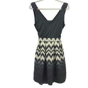EUC, Excellent Used Condition. This Charming Charlie dress has a black top with a criss-cross open back design. The bottom of the dress is in a black & taupe chevron pattern and is lined. There is a zipper at the back of the skirt. A fun dress for a party, date night, or a special occasion. No rips, tears, or stains.