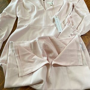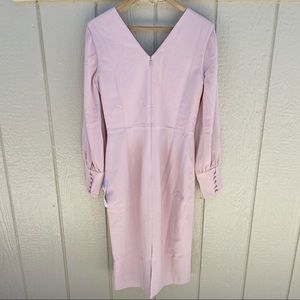 Billowy sleeves with wide rouleau-button cuffs put a romantic spin on this form-fitting dress with a sharp, plunging neckline and slit pencil skirt.