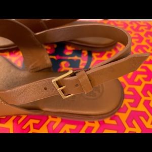 Tory Burch Benton flat thong sandals in beautiful Royal Tan leather. Cushioned foot bed with adjustable buckle strap closure makes these the perfect sandals to wear for all day comfort… Raised classic Double-T signature logo on the top in rolled brass gold takes center stage. New, never worn in size 6.5.