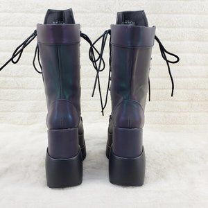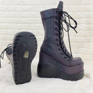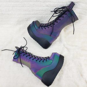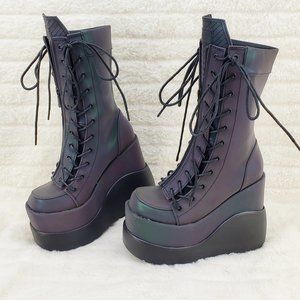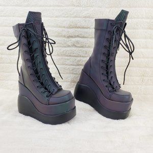 Void Purple Green Reflective Platform Wedge Mid Calf Goth Festival Boots NEW