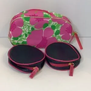 Estee Louder 3 cosmetic bags pink floral and navy blue in great preowned condition.