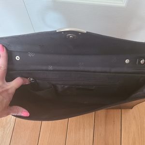 ● Logo Jacquard Lining with 2 slip and 1 zip pockets. Measures approx.: 15.5" Width, 8.75" Height, 2.25" Depth, adjustable shoulder strap. Sells for $200 used.
