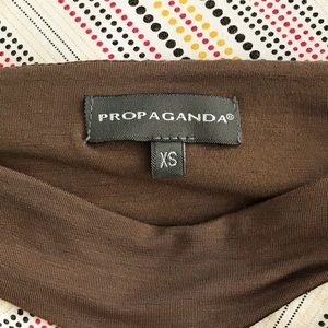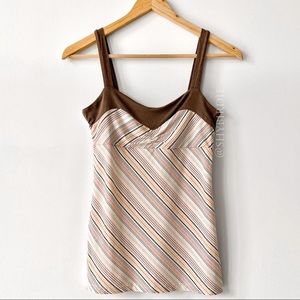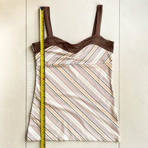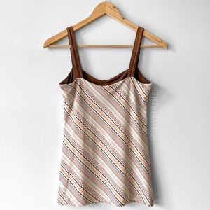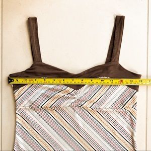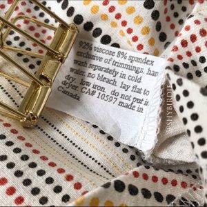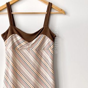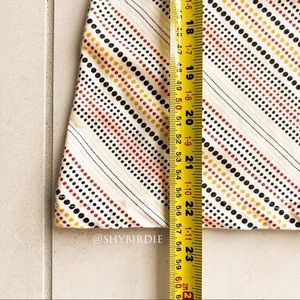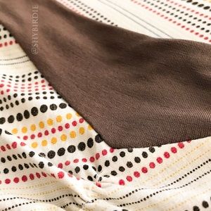 - Cream base with brown accents at top of bodice and straps; heathered black, yellow, and red dots in a diagonal stripe in a faded, vintage-look printed pattern