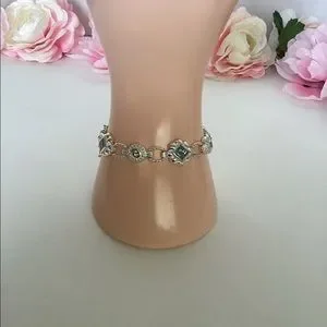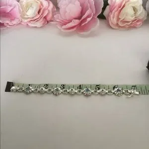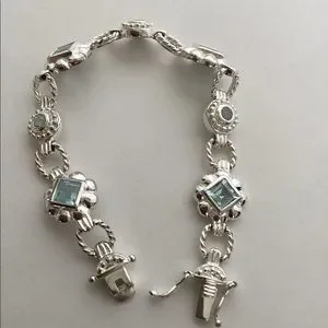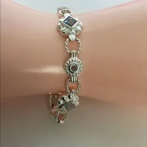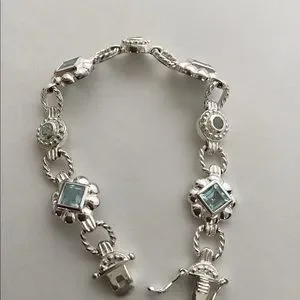 925, Approx,7” Long. Insert clasp with two safety 8 clips. Sterling Silver, Roidium no tarnish finish. Natural Blue Topaz bezel set squares and round shape. Unique Byzantine style. Heavy and very well made. Pre-Owned “like new” condition. Looks like expensive white gold bracelet. stamped 925. 610STB1 Sales support street cat rescue TNR with maintenance.