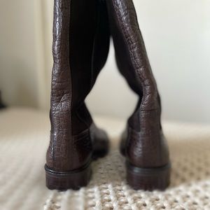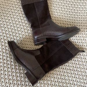 Suede and leather upper leather lining and sole padded insole imported. Color: brown. Leather has a croc embossed look to it.