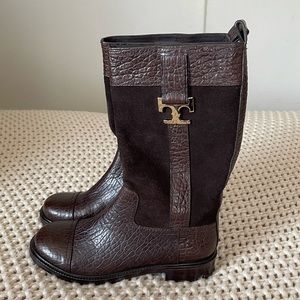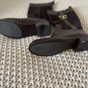 pebbles leather boots feature suede panels at the shaft. Logo medallion on outer side. Stacked heel. Non-slip rubber patch at leather sole. Heel: 1” (25mm)