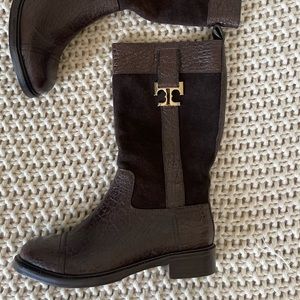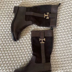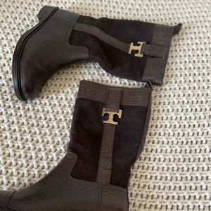 Textured leather and supple suede design with a goldtone T emblem at the side