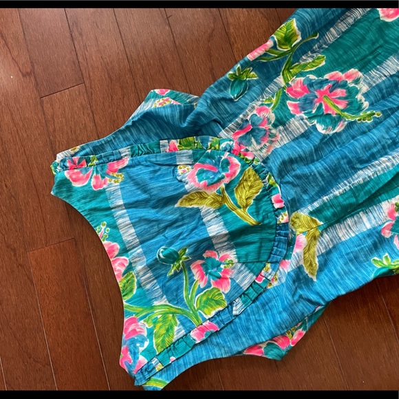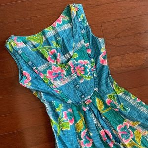 Made in Hawaii! True vintage Makamae O Hawaii label. Gorgeous blue background with pink and green floral pattern. Buttons down front leading to a zipper. Ruffle trim around bust, matching in back as well. Great length for a petite person. Questions? Comment below. Offers welcome.