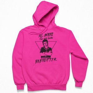 NEW! Stranger Things theme pullover hoody sweatshirt in a bright retro 80's fun hot pink color. Features Steve Harrington with arms crossed and posed with the words "Always the God Damn Babysitter".