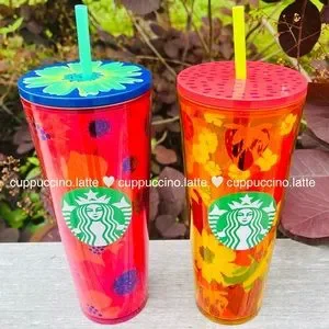 đ1 Starbucks Neon Coral âDancing Bloomsâ Floral Tumbler with Flower Print Lid & 1 Orange âStrawberry Fieldsâ Tumbler with Pink Strawberry Seed Printed Lid | Double wall acrylic cold cup tumblers | BOTH BRAND NEW with tags fully intact on bottom | 2022 Summer 2 Collection | Venti (Large) 24 ozđ§Ą