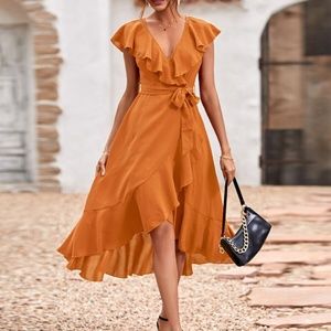 Boho Dark Green ruffle hem wrap belted Maxi Dress