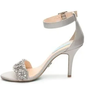 Silver Betsey Johnson sandal worn once to a wedding. Classic powder blue sole with pearl, jewel, and beaded embellishments across top of shoe. Faux leather and satin, 3.5 inch heel, and adjustable ankle strap. Perfect wedding shoe for a BRIDE, guest, or bridesmaid.