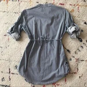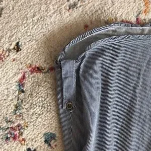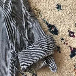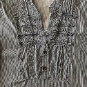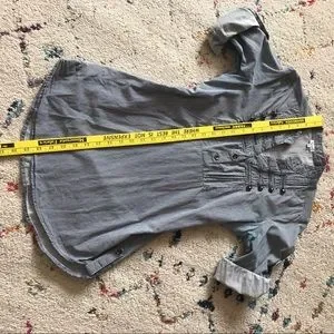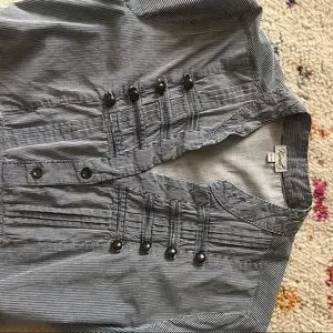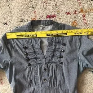 Kismet cotton shirt size XS but fits S perfectly, blue stripes, 3/4 sleeves that can be rolled up, ties in the back for fitted look, nice details, with (in last photo) 8 buttons that I have removed but will stitch back or add to package if you ask. Zoom in for details and measurements, and ask questions