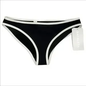 Black and white ribbed bikini bottom by Athleta. Mid rise waist with medium coverage. Lightly textured AquaRib. White bonded hems add a pop of color.