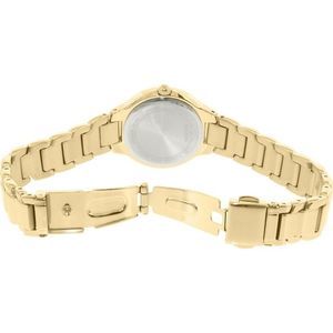 From the Bulova Diamonds Maiden Lane collection. In stainless steel with gold-tone finish with 26 diamonds individually hand-set on case and black dial, flat mineral glass, fold-over closure, and water resistance to 30 meters.