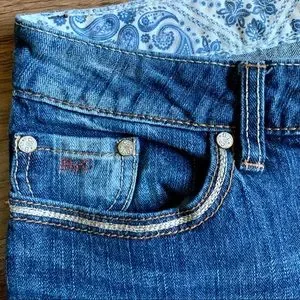 My favorite pair of jeans in pristine condition. Medium to heavy weight denim; great stitching details on front and back pockets; buttons for accents. Flared leg. 34” inseam. Measure 17” waist; 21” hips.