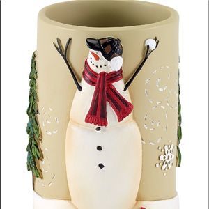Trim your bath for the season with the spirited Snowman Gathering tumbler by Avanti. This durable piece showcases a buoyant, frosty fellow amid a snowscape with tree, snowflake, and bird details.