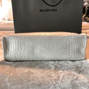 Medium Matte croc embossed supple calf skin Balenciaga in white, with silver hardware. Removal crossbody strap. Brand new! Never worn! Comes with bag, dust bag. Original price $2950 CAD