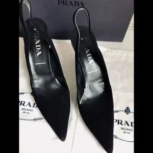 Prada pointed toe black suede slingback pump 4 inch heel size 8 1/2. Original owner original box,2 shoe dust covers, original Extra set of heel tips. Only worn three times. Very very good condition. Non-smoker no pets no damage. I typically wear a 7 1/2 these fit me perfect.Same day shipping. See separate listings for other pictured shoes each sold separately. Bundle and save.
