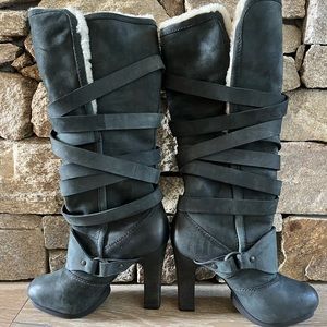 ALLSAINTS “Antigone” Dark Grey Nubuck Suede, Shearling Lined Knee High Boots