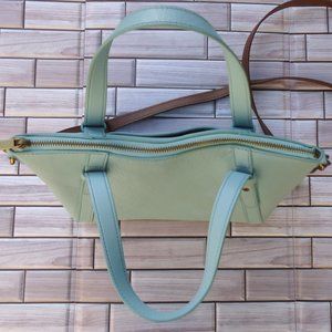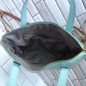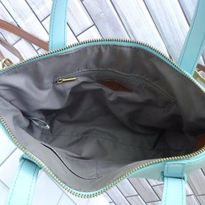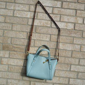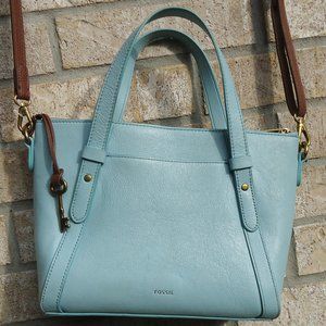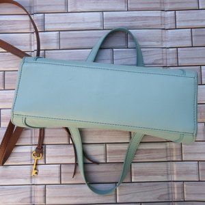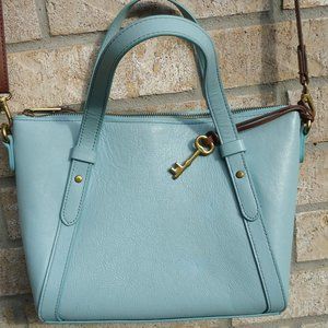 FOSSIL leather crossbody tote bag. Top zipper closure. Interior has one main interior compartment with 1 zip pocket 2 slip pockets. Exterior 1 side slip pockets. Gold tone hardware and fossil key charm. Purse is in good preowned condition and the only some couple slightly of pen marks. shows pic. 14, 15. From a smoke-free home. Clean inside and out. Please zoom in all pictures for details and condition. Item in pictures is the exact item you are purchasing. Approx. measurements: W 12" x H 8.5". Strap drop 27". Handles 8". Base: 9.5" x 3.5".