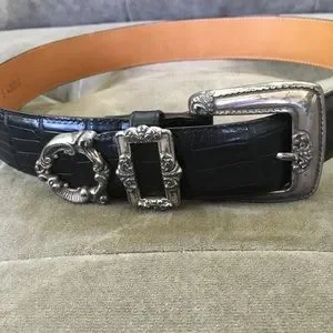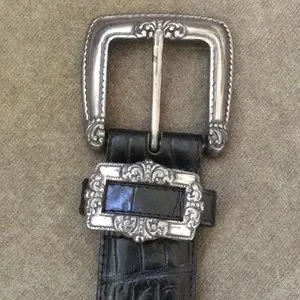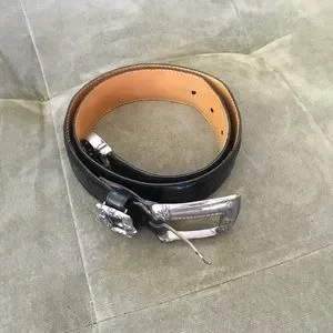 This beautiful black leather belt has an ornate silver plated buckle and a snakeskin print. Brighton is well known for their quality pieces. The total length of belt with buckle is 34”” for the small waisted gal, size small. Preowned.