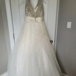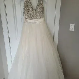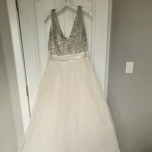 Wedding Dress, bought brand new, tailored to fit a size 10, approx. ~155 pounds and 5'4". Off white with beaded top.