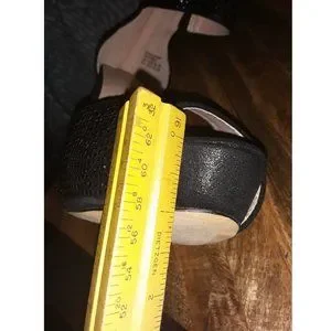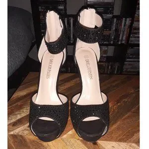 Made by Dream Pairs. Style is the Swan Platform Heels in Black Pearl Shine. Has beautiful black rhinestone/pearling details all around toe strap, ankle strap, and back of heel. Heel stem and platform are covered in a shiny satin-like fabric. Retails for $60.