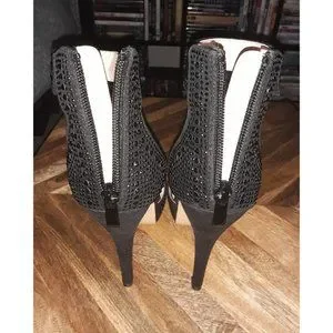 Heel length is approx 5 in. Platform height is approx. 1 in. See measurement photos included in post. Ankle straps. Zippers in back of heels for closure. Padded footbed. Peep toe. stilleto heel.