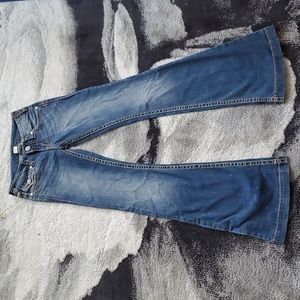 All discoloration and spots are part of the manufacturer's design. Medium blue color with rusty orange/white/light mustard yellow thread. W25/L33