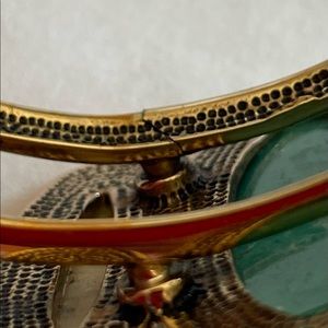 Stunning gemstone cuff bracelet set in a nice and mailable brass metal that can easily be pinched or stretched to fit your wrist size nicely. The center turquoise stone measures alittle over 1-1/2” and is a stand alone showpiece❣️😍 There is a hairline fracture, however, I have tried to tug and twist it to see if it was loose in any way or come apart and it wouldn’t budge and still feels solid so I’m confident enough to post it for sale. You can apply a few drops of glue as added protection or it can also be welded by a good jewelry repair shop.