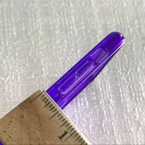 Purple case. "KATE SPADE NEW YORK" printed at rear of case with multi-color stripes. "I'M ALL EARS" and "Kate Spade New York" printed inside of case (see photos).