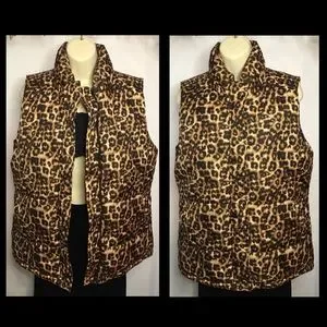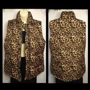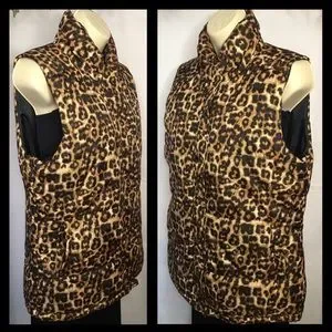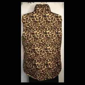 Cute leopard print outerwear vest. Lightweight but still very warm. Full front zipper and press buttons. Black polyester lining/outer shell polyester. High collar. Side pockets.