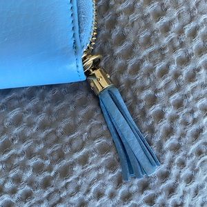 Gucci Soho continental wallet. Blue leather (professionally coated to maintain quality). Interlocking G logo. Gold-toned hardware. Tassel accents.