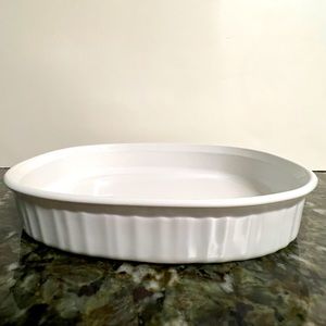 Corning Ware French White 1 1/2 quart oval casserole Excellent condition For oven and microwave Ribbed sides 11” x 8 1/2” 2” Deep