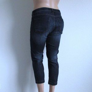 These trendy rich blue cropped straight leg denim jeans feature fading to front and rear. Front thigh whiskers. Slightly distressed front pockets. 1" leg opening hem. 5 pocket, button/zip fly closure. Stretch.