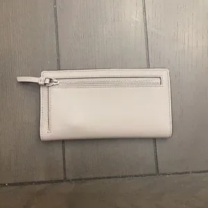 Kate spade wallet with dual pockets for cash and many slots for cards. Color is light gray, almost has a light purple tone. It is in great condition with no obvious signs of wear or damage.