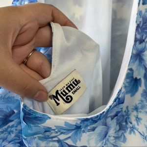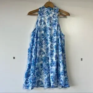 Show me your mumu chiffon v-right back sleeveless floral halter plunge swing mini dress. A beautiful, flowy mini dress with vibrant blue and white floral print, a cutout v-back, and halter neck. Super flirty and flattering for the summer! This colorway and print is similar to the reformation teacup print! Gently pre owned