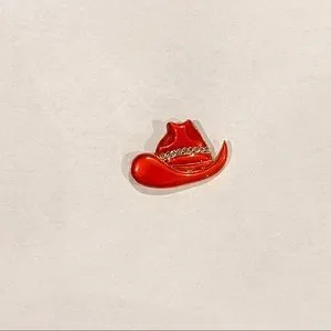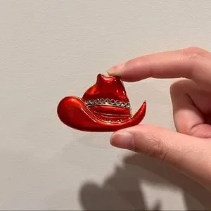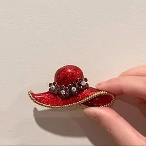 Super cute hat shaped pin/brooch. Can be used on clothes or bags. Has rhinestones on it. In excellent condition. See last pic for size reference.