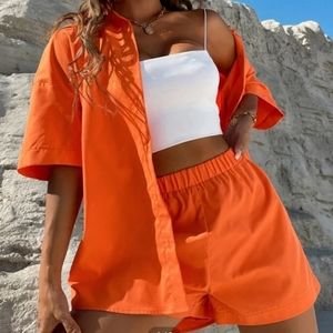 Neon orange button through top & shorts set