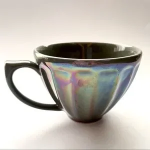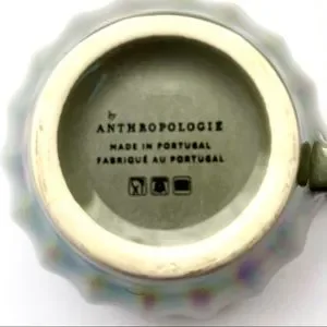 This Lustered Latte Mug by Anthropologie has a beautiful iridescent sheen over a grayish base. It has a wide brim and is dishwasher and microwave safe. Pre-owned, but in good condition.