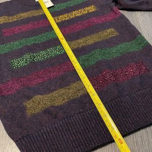 Fabulous Chanel 2012 Fall Ready to Wear Runway Collection crystal & metallic multi color shimmery pullover sweater. Unworn with original retail tags. Beautiful, vibrant piece in a rich color palette of: indigo purple, pink, green & gold. Very shimmery sweater with iridescent metallic thread throughout & large crystals forming an elegant color block pattern. A large CC logo made of aurora borealis crystals, adorns the bottom right of the sweater. The CC logo flashes pearl pink tones. A magical & ethereal piece crafted of soft wool & a mohair blend. Retail $1,920.00. Size 36, fits like a small, with comfortable stretch.