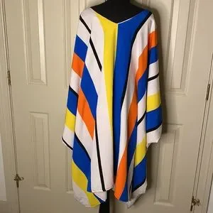 Gorgeous, color block, stripe, kaftan, cover-up which can be worn as a dress or top as well! Bright orange, royal blue, white, black. V-neck. One Size. Has slight pulling or light lint in a few areas easy to fix. Still a beautiful piece!