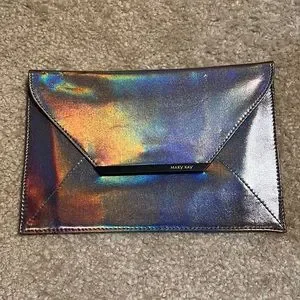 This is a never used Mary Kay envelope clutch bag, it is iridescent/metallic gray color and is vegan leather with a cloth lining. I got it for a wedding but didn't end up using it. Although I haven't used it it seems like it has a few impressions on it☹️, it's hard to see them though, I've pictured what I'm talking about in the last few pics. Please feel free to make me an offer! Thanks for looking!❤️