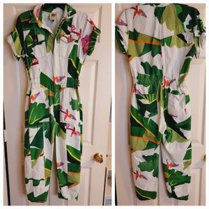 A playful one-and-done outfit, this denim FARM Rio jumpsuit updates a utilitarian-inspired style with a colorful tropical print.Fabric: Mid-weight, non-stretch denim. Rare.