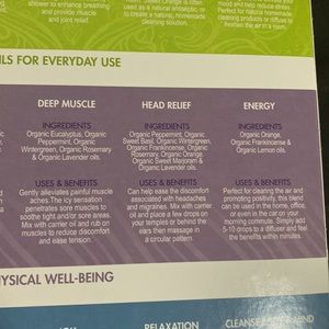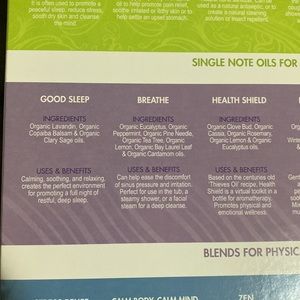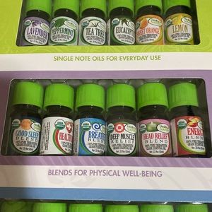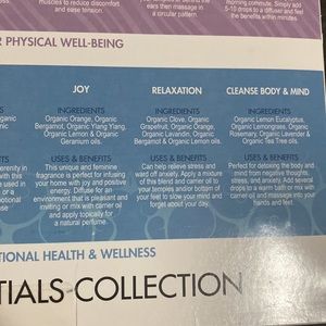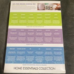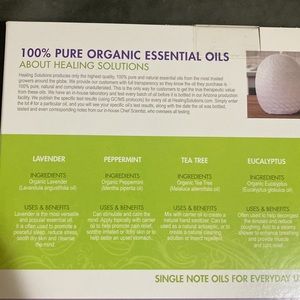 Healing Solutions Home Essentials Collection with “Everyday - single note oils for everyday use”, “Body - blends for physical well-being”, and “Mind - blends for emotional health and wellness”. Each bottle is .33 floz (10ml)