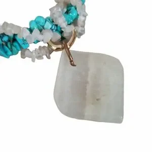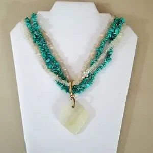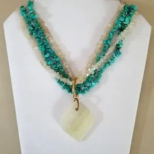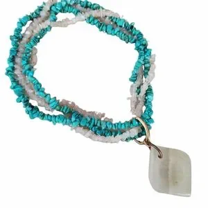 Removable moonstone clip pendant holds the strands of Turquoise and Agate together or separate and can be worn long or short.