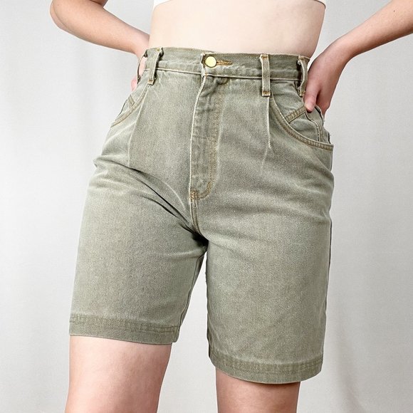 Vintage Ultra High Rise Sage Green Rigid Wedgie Denim Pleated Long Jean Shorts