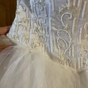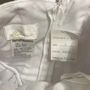 David’s Bridal Wedding Dress Size 6. Corset size 34B. Full slip size 8. Brand new with tags never worn just tried on and it was taken in a little but not much!